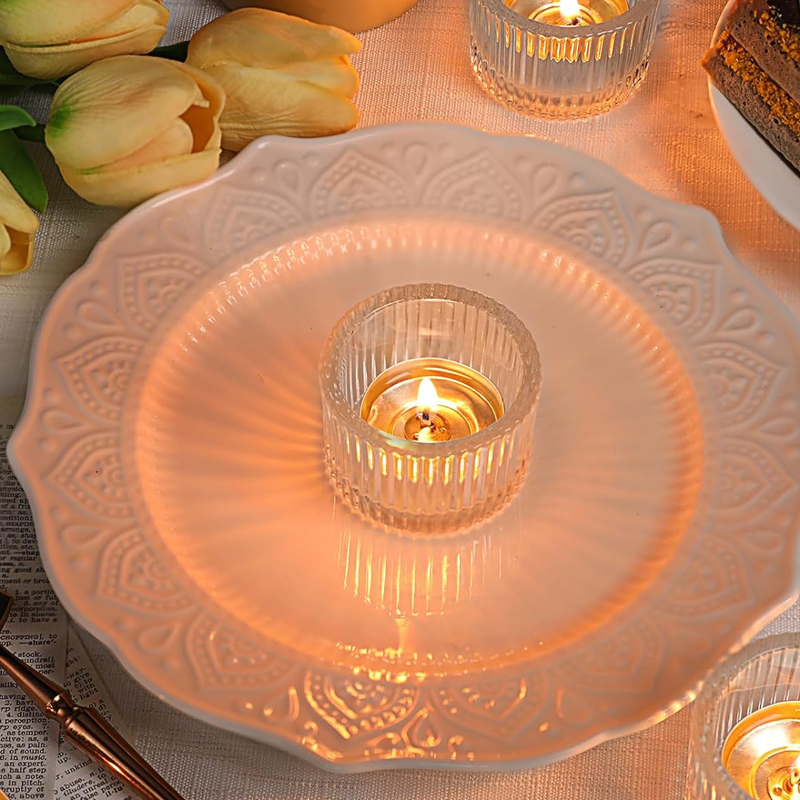Clear Candlestick Set – 12-pack, glass, clear tea candlesticks, 2 inches in diameter x 1.4 inches high, suitable for parties, home, Halloween, and wedding decorations.