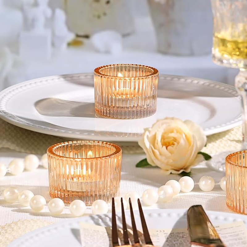 Golden Candlestick Set – 12-pack, glass, golden tea candlesticks, 2 inches in diameter x 1.4 inches high, suitable for parties, home, Halloween, and wedding decorations.